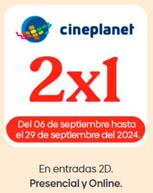 La promoción es en Cineplanet y es válida desde el 06 de septiembre hasta el 29 de septiembre del 2024, comprando con Tarjetas de Crédito, Débito BancoEstado o BE Pay.