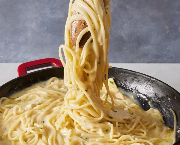 4- Después de sacar el brie del horno, agrega inmediatamente los espaguetis a una sartén y revuelve con unas pinzas hasta que estén totalmente cubiertos con el queso. Si el brie está demasiado espeso, agrega gradualmente agua de cocción de la pasta para aflojarlo. Sirve inmediatamente con parmesano rallado.