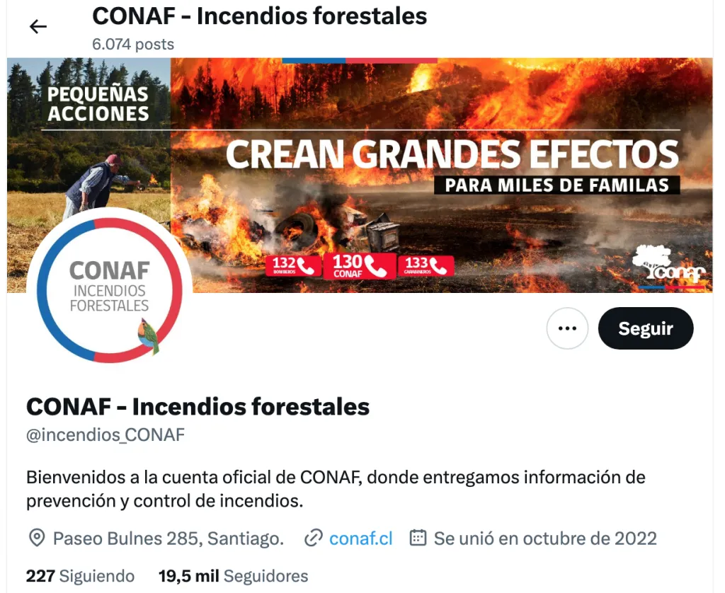 La cuenta de CONAF informa sobre incendios activos, la superficie preliminar afectada por los siniestros y los recursos utilizados en ese momento, como brigadas, helicópteros o aviones cisternas, entre otros. Además, comparte alertas de evacuación emitidas por SENAPRED y la información oficial proporcionada por la Dirección Meteorológica de Chile.
