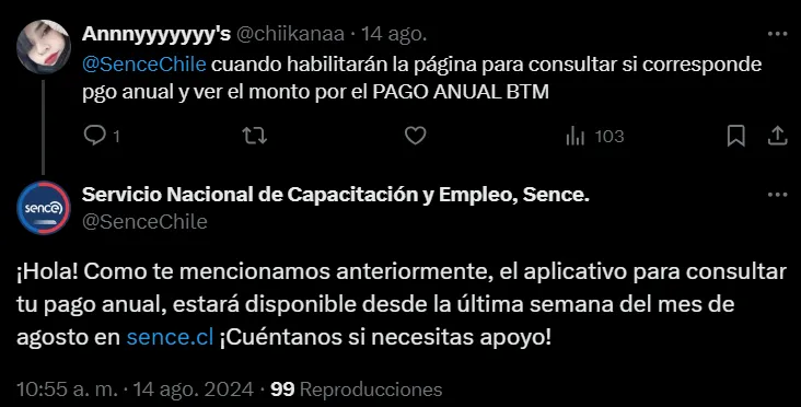 De acuerdo a la información publicada por el Servicio Nacional de Capacitación y Empleo (Sence) en la red social “X”, la fecha de pago exacta del Bono a la Mujer Trabajadora lo podrás conocer desde la última semana del mes de agosto en el sitio sence.gob.cl, es decir, entre el 26 y el 30 de agosto, junto a esto, se encontrará el aplicativo para consultar los montos de los pagos anuales, con respecto a las rentas del 2023.