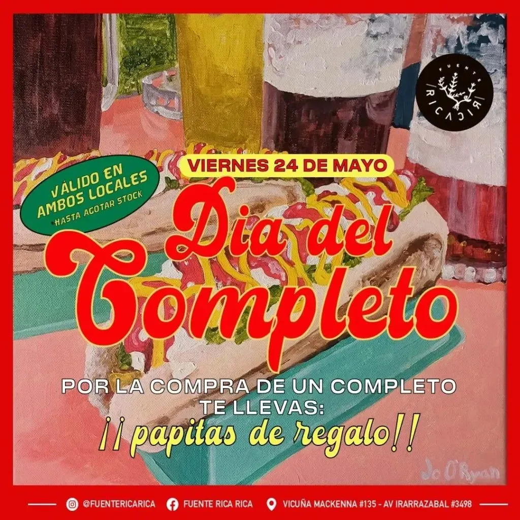 Fuente Rica Rica, este local ubicado en Av. Irarrázaval 3498, se caracteriza por la venta de comida vegana, pero los completos son uno de los clásicos y para este viernes 24 ofrecen la promoción de llevarse una porción de papas fritas gratis, por la compra de un completo.