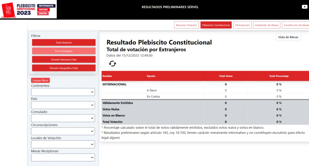 Para revisar los resultados de las elecciones del Plebiscito Constitucional debes ingresar al sitio web www.elecciones.servel.cl/. Si deseas ver los resultados del extranjero, tienes que hacer clic en donde dice “En el extranjero”.