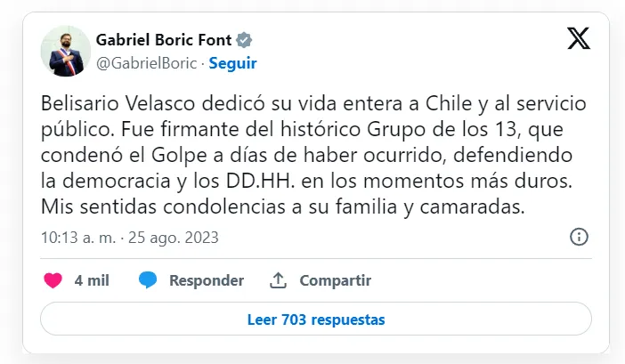 “Belisario Velasco dedicó su vida entera a Chile y al servicio público. Fue firmante del histórico Grupo de los 13, que condenó el golpe a días de haber ocurrido, defendiendo la democracia y los derechos humanos en los momentos más duros”, publicó Boric en su cuenta de Twitter.