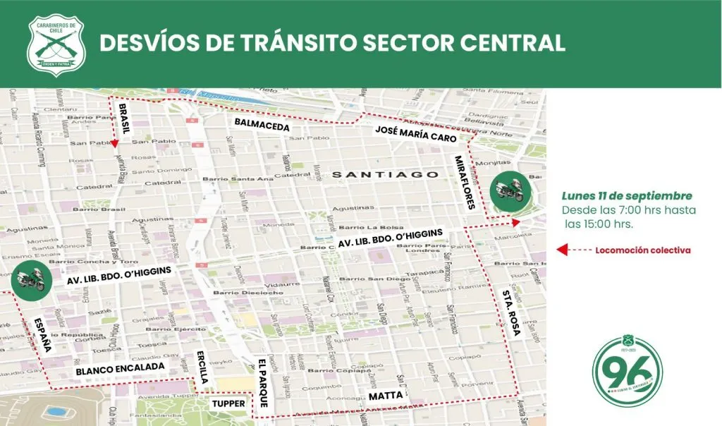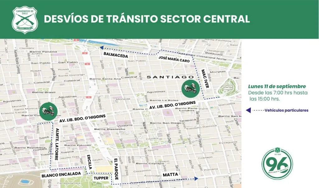 Por la conmemoración de un nuevo 11 de septiembre, el portal Transporte Informa de la Región Metropolitana informó que Carabineros realizará cortes y desvíos en el sector centro de Santiago, por lo que recomendaron no moverse en auto por el centro de la capital, sino que en Metro o autopistas.
