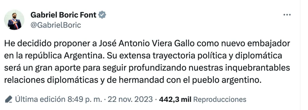 De esta forma se refirió el Presidente Gabriel Boric a través de X (ex Twitter) tras proponer a Viera-Gallo al cargo de embajador en Argentina.
