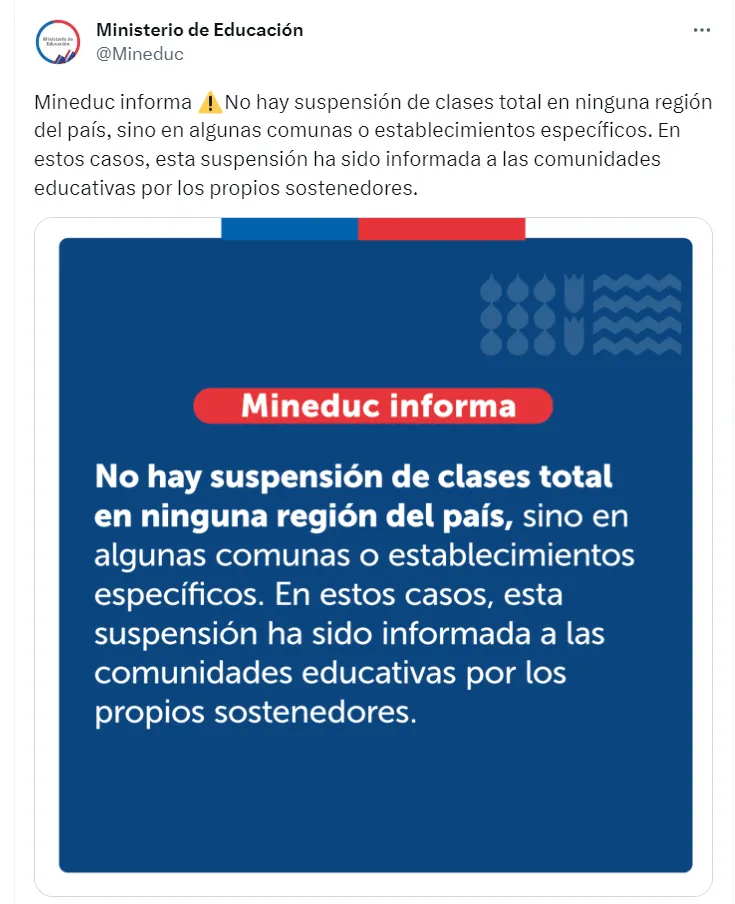 El Mineduc informó recientemente en su cuenta de Twitter que “no hay suspensión de clases total en ninguna región del país, sino en algunas comunas o establecimientos específicos. En estos casos, esta suspensión ha sido informada a las comunidades educativas por los propios sostenedores“.