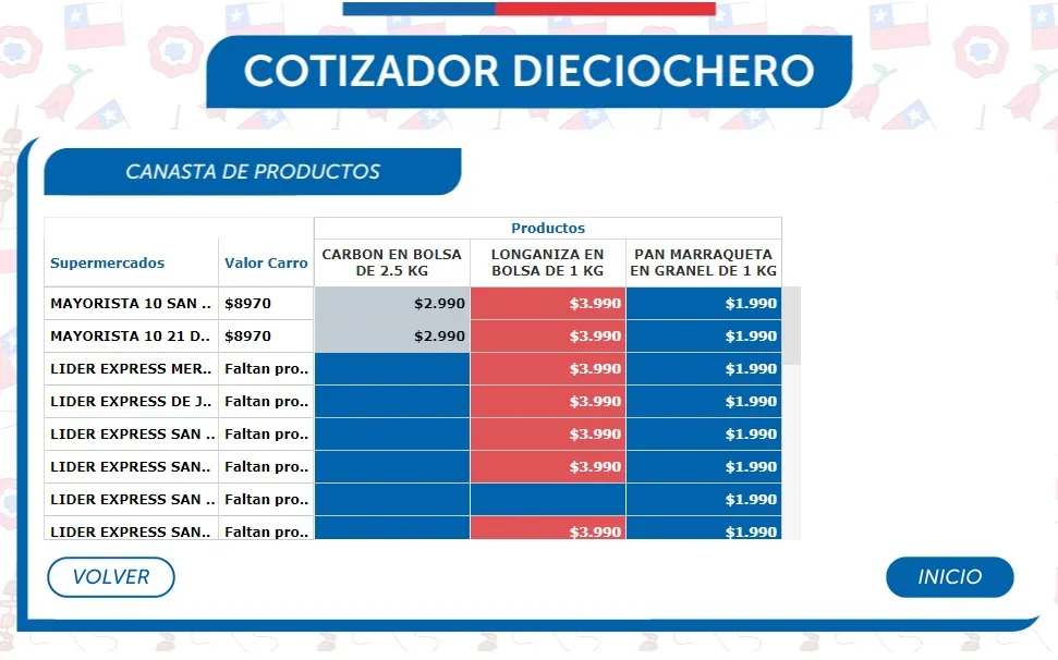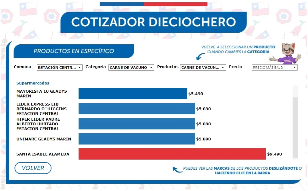 El Sernac desarrolló esta herramienta para que los usuarios puedan consultar y comparar los precios de una variedad de productos esenciales para las celebraciones patrias. El cotizador abarca desde carnes y empanadas, hasta alcohol y productos básicos como pan y carbón.