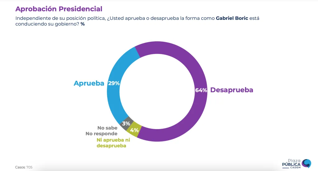Frente a la pregunta: “Independiente de su posición política, ¿Usted aprueba o desaprueba la forma cómo Gabriel Boric está conduciendo su Gobierno”, solo un 29% aseguró que “aprueba” la actual gestión del Mandatario.