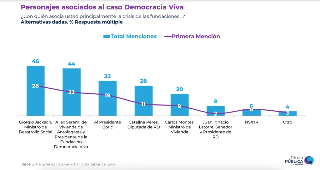 En cambio, un 44% lo relaciona al exseremi de Vivienda de Antofagasta y Presidente de la Fundación Democracia Viva (Carlos Contreras), y completa el podio con un 32% al Presidente Gabriel Boric.