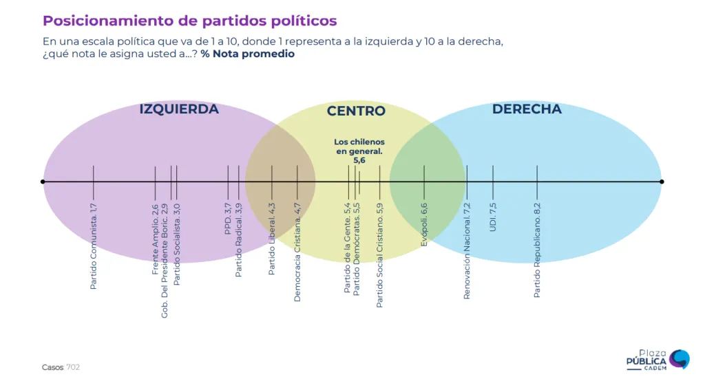 Además, se les consultó que en una escala de 1 a 10, donde 1 representa a la izquierda y 10 a la derecha, los ciudadanos se ubicarán a ellos mismos y a los partidos, donde el Partido Republicano obtiene una nota 8,2 (Más a la derecha); seguido por la UDI 7,5; RN 7,2 y Evópoli 6,6, posteriormente nos vamos a la izquierda donde el PDC fue calificado en 4,7; PPD 3,7; el PS 3,0, el gobierno del Presidente Boric 2,9; el Frente Amplio 2,6 y el PC 1,7 (Más a la izquierda).