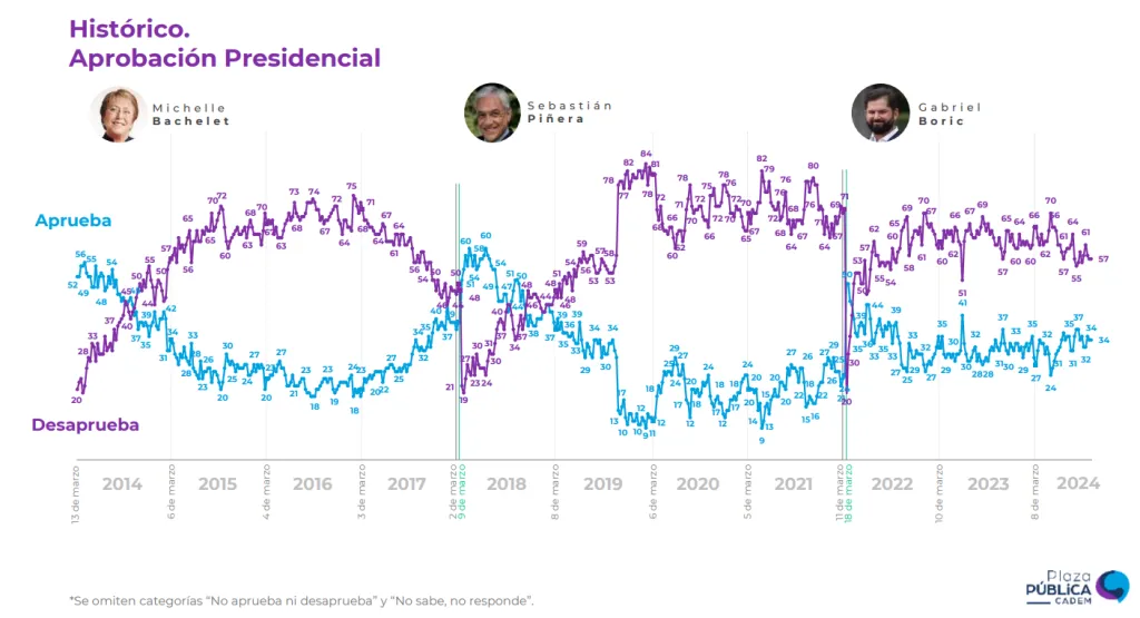 De todas formas, la aprobación del Mandatario sigue siendo la mejor de los últimos tres presidentes en su tercer año, superando ampliamente los niveles conseguidos por Michelle Bachelet (27%) y Sebastián Piñera (29%), aunque de todas formas ambos se encontraban en su segundo mandato.