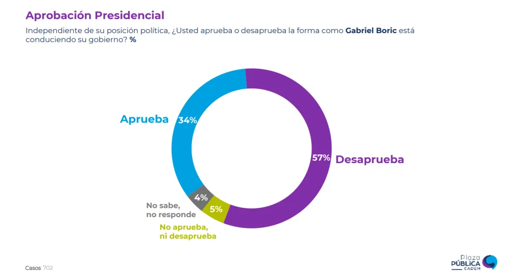 La encuesta Plaza Pública de este domingo informó quela aprobación al Gobierno del Presidente Gabriel Boric para la primera semana de octubre fue de un 34%, es decir, se produjo una variación de 0% con respecto a la encuesta anterior, específicamente a la semana del domingo 29 de septiembre donde también marcó un 34%.