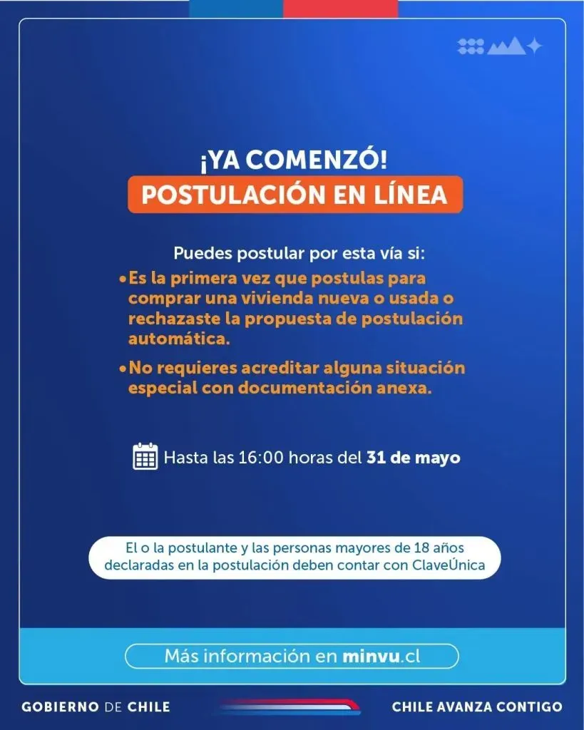 El proceso de postulación se hace a través del sitio web del MINVU y se abre dos veces al año (actualmente estará abierto hasta el 30 de mayo) y se exige los siguientes montos de ahorro: