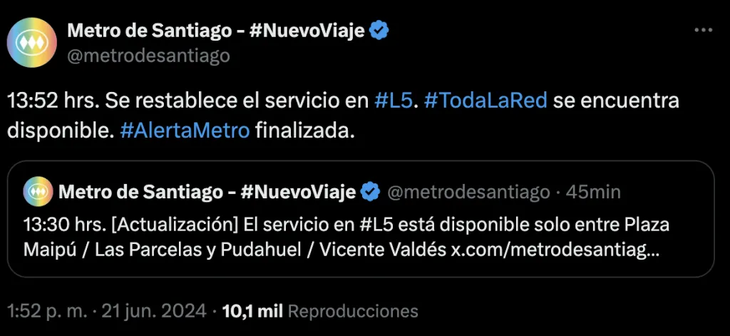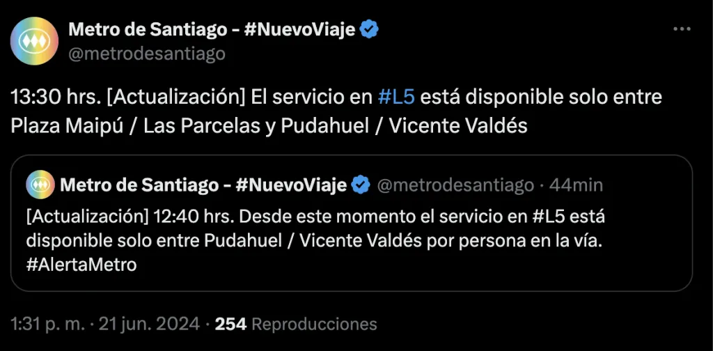 Luego de que Metro de Santiago informara que el servicio de la Línea 5 solo funcionaba entre Vicente Valdés y Pudahuel por una persona en las vías. Ahora también está en funcionamiento entre Plaza de Maipú y Las Parcelas.