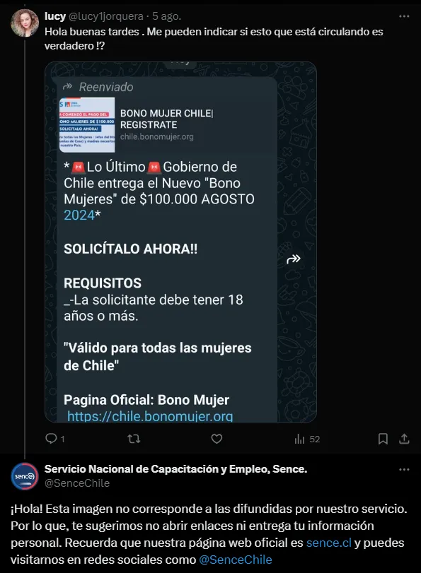 El Servicio Nacional de Capacitación y Empleo (Sence) utilizó sus redes sociales para informarle a la ciudadanía la circulación a través de redes sociales y de WhatsApp de información falsa correspondiente a un supuesto “Bono Mujer” que solicitaba datos personales y el ingreso a un link desconocido.
