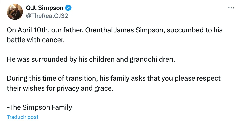 A través de la cuenta personal de O.J. Simpson en X (Twitter), la familia confirmó mediante un comunicado que “El 10 de abril, nuestro padre, Orenthal James Simpson, sucumbió a su batalla contra el cáncer. Estaba rodeado de hijos y nietos. Durante este tiempo de transición, su familia pide, se respete sus deseos de privacidad y gracia. Atentamente la familia Simpson”.