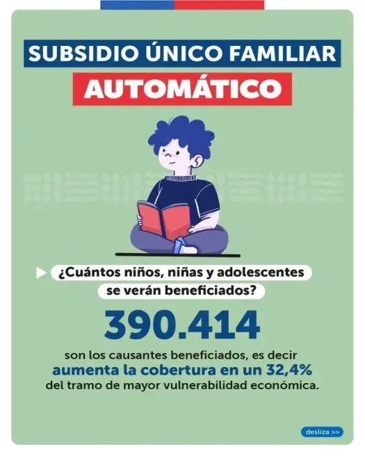 El Subsidio Familiar Automático entrega el mismo monto que el Subsidio Único Familiar, es decir, $20.328 para cada causante o carga familiar, el que beneficiará a 390.414 niños, niñas y adolescentes (NNA) en total.