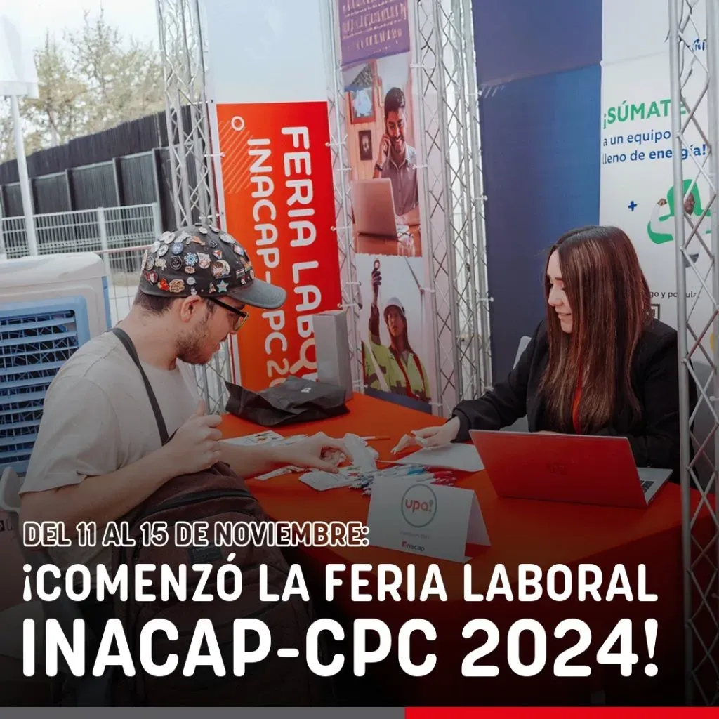 Se realizará entre los días 11 y 15 de noviembre de manera online en www.inacap.cl/ferialaboral2024 y las jornadas presenciales los días 12 y 13 de noviembre desde las 9:00 a las 16:00 hrs.