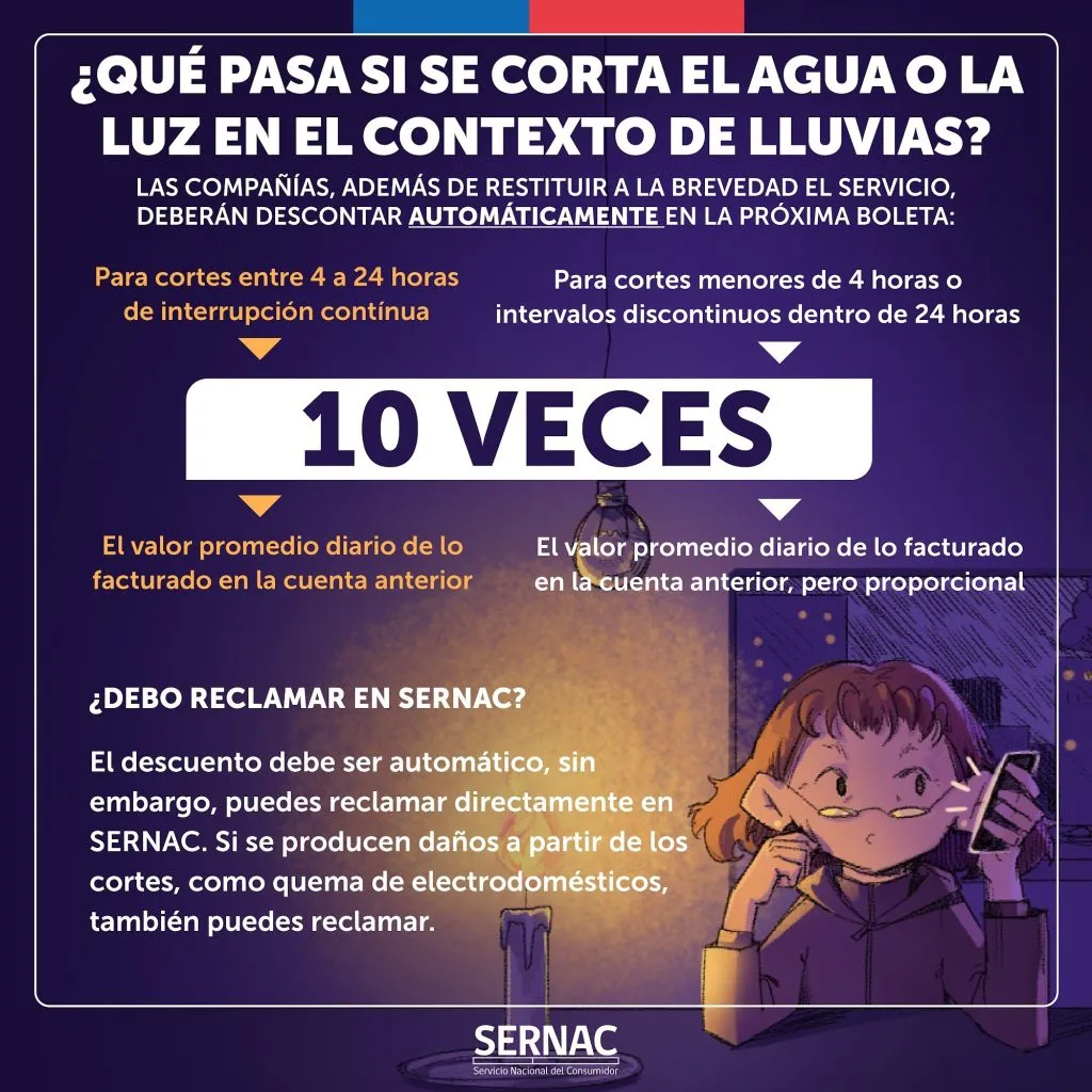 Este miércoles 12 de junio, el Servicio Nacional del Consumidor (SERNAC) informó a través de la misma red social “X” que, si hay cortes de luz o agua en tu hogar a causa de este sistema frontal, la empresa encargada del servicio tiene la obligación de:
