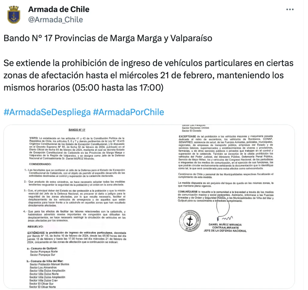 La Armada anunció el pasado martes un nuevo toque de queda para algunas comunas de la Región de Valparaíso, el cual recordemos se inició tras el mega incendio forestal que afectó a zona centro norte de Chile.