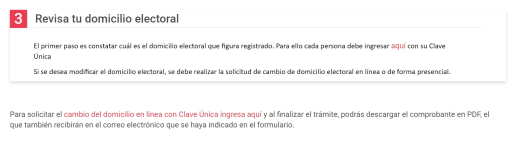 Después, pincha la opción “Cambio de Domicilio Electoral”. Una vez dentro, baja y busca donde dice en rojo “cambio del domicilio en línea con Clave Única ingresa aquí”, si haces clic, el sitio te pedirá iniciar sesión con tu Clave Única. Posteriormente, deberás actualizar los datos de tu domicilio electoral, y listo.