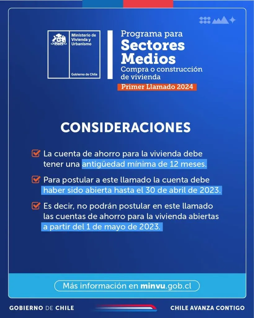 ¡Ojo! que en la misma publicación del MINVU señala que quienes quieran postular a este llamado, deberán tener el ahorro mínimo depositado y como saldo disponible en la cuenta de ahorro para la vivienda hasta las 14:00 horas del 30 de abril del 2024.