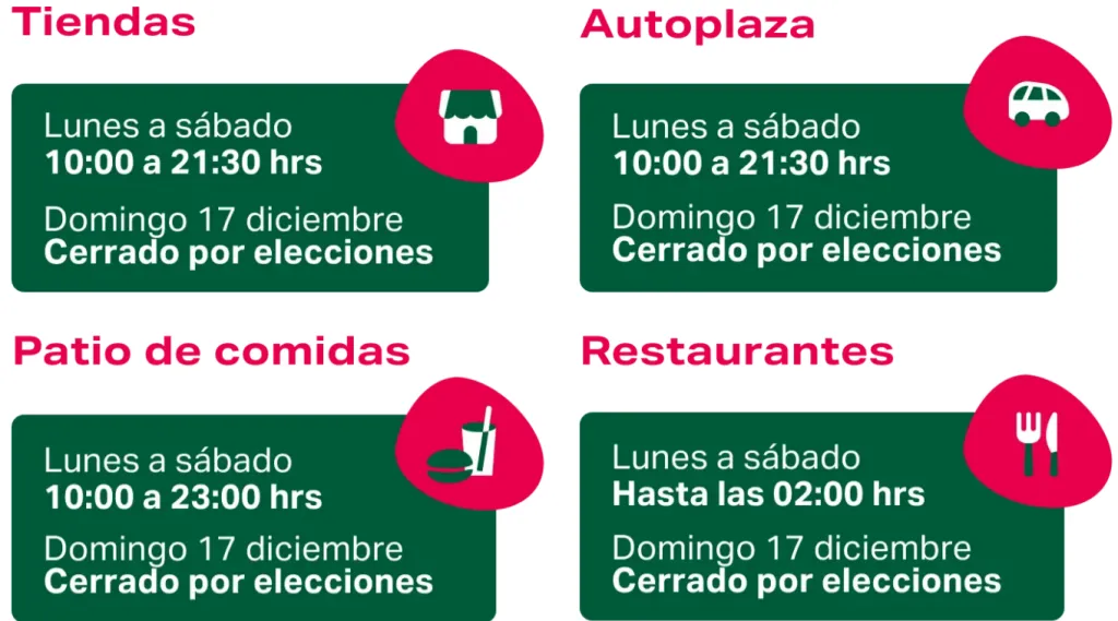 - Este domingo algunos locales cerrarán, por lo que AQUÍ puedes ver los que abrirán. De los que estarán cerrados terminan de operar hoy sábado a las 19:00 horas. El resto tendrá hora de cierre habitual que generalmente es a las 21:00 horas, pero que puedes revisar en este ENLACE.