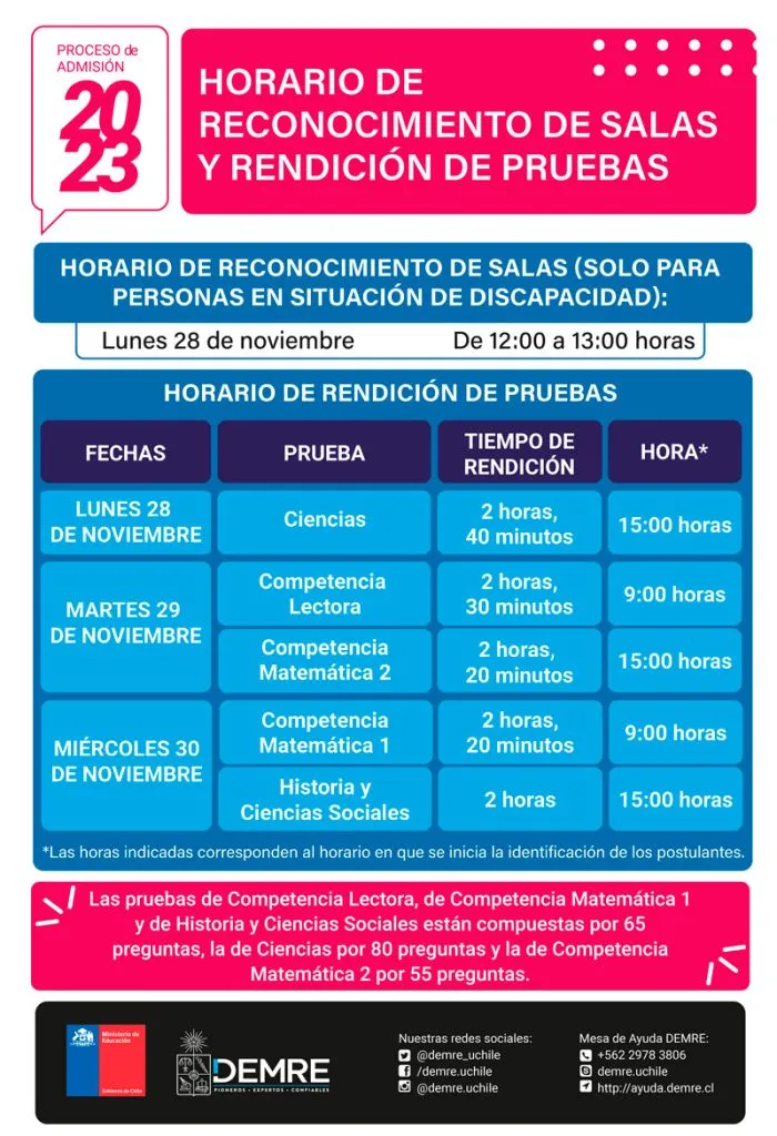 - 09:00 (Rapa Nui 08:00): Prueba de Competencia Lectora. Son 65 preguntas en 2 horas y 30 minutos.