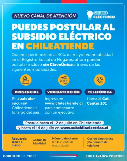 Para apoyar las postulaciones del Subsidio Eléctrico, la red de atención ChileAtiende del Instituto de Previsión Social (IPS) dispuso de canales de atención que atenderán excepcionalmente hasta este sábado 13 de julio, de 09:00 a 13:00 horas.