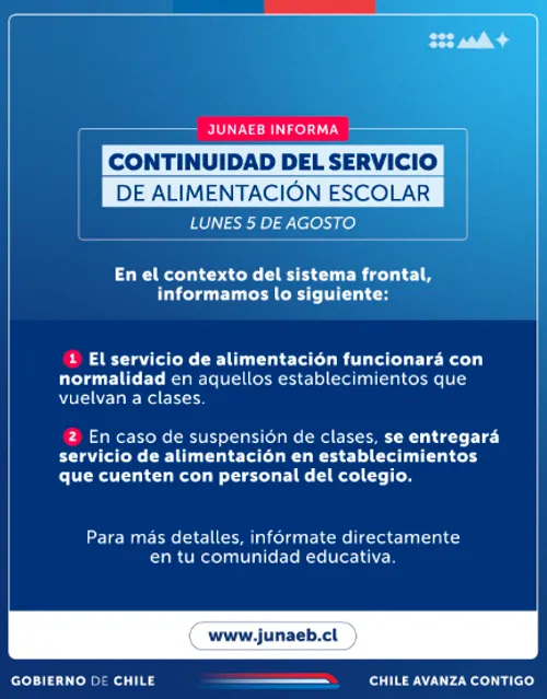 Desde el comienzo del último frente de mal tiempo, y para colaborar con la población damnificada, la Junta Nacional de Auxilio Escolar y Becas (Junaeb) activó sus protocolos de monitoreo, y posterior despliegue logístico para la entrega de alimentación completa (desayuno, almuerzo, once y cena).