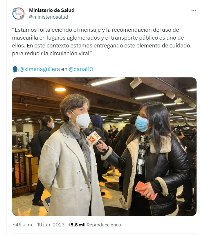 Acerca de la nueva medida del Minsal de entregar mascarillas en el transporte público, como el Metro de Santiago, la ministra de Salud, Ximena Aguilera, señaló que “estamos fortaleciendo el mensaje y la recomendación del uso de mascarilla en lugares aglomerados y el transporte público es uno de ellos. En este contexto, estamos entregando este elemento de cuidado, para reducir la circulación viral”.