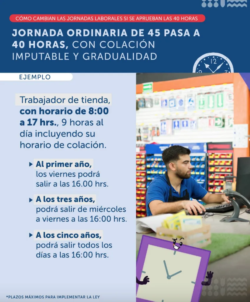 “La entrada en vigencia de la rebaja a 40 horas se hará gradualmente: 44 horas al primer año, 42 al tercero y 40 horas al quinto, contados desde la publicación de la ley”, según informa ChileAtiende.