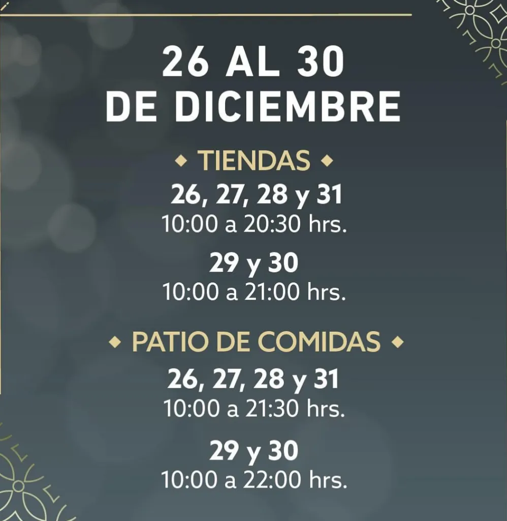 - Patio de comidas: 10:00 a 21:30 (26, 27, 28 y 31 de diciembre) y 10:00 a 22:00 (29 y 30 de diciembre).