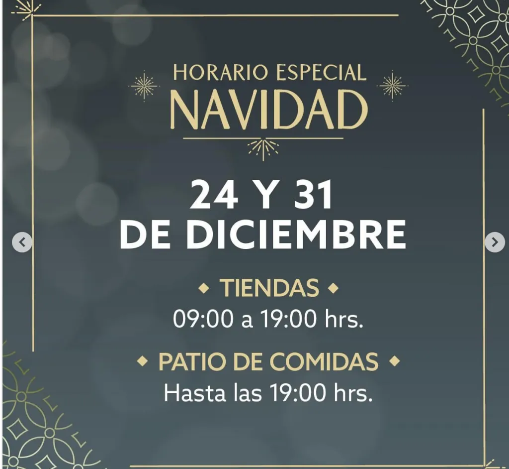 - 24 de diciembre: Tiendas: de 09:00 a 19:00 horas / Patio de comidas: hasta las 19:00 horas.