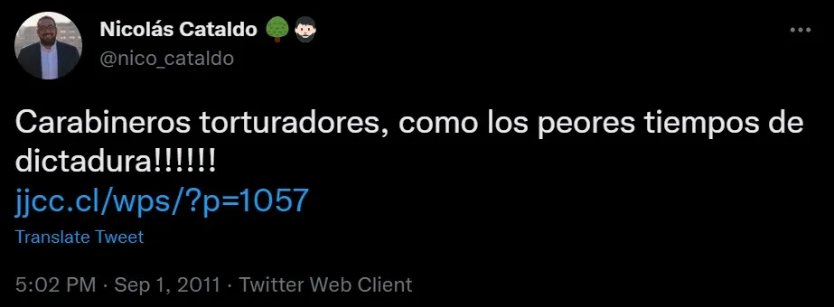 Un mes después, volvió a mencionar a Carabineros. “Carabineros torturadores, como los peores tiempos de dictadura!!!!!!”, tuiteó en septiembre de 2011.