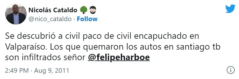 Ese mismo mes, publicó un mensaje dirigido al entonces diputado Felipe Harboe. “Se descubrió a civil paco de civil encapuchado en Valparaíso. Los que quemaron los autos en santiago tb son infiltrados señor @felipeharboe”, escribió.