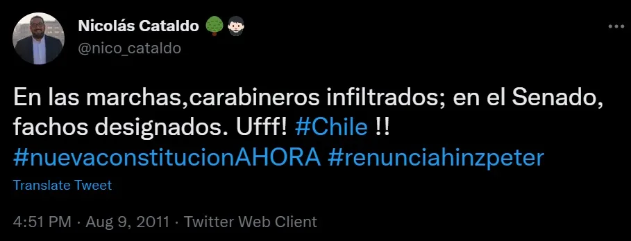 “En las marchas, carabineros infiltrados; en el Senado, fachos designados”, publicó Cataldo en uno de los tuits que data de agosto de 2011, en el marco de las protestas estudiantiles de la época.