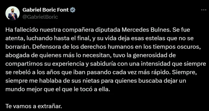 Este viernes se conoció el fallecimiento de la diputada de 74 años, Mercedes Bulnes, luego de una batalla contra el cáncer de colon, enfermedad que la hizo pública la misma representante del distrito 17 de la región del Maule el pasado mes de abril del presente año. Es en ese contexto que uno de los primeros en referirse a la perdida de la parlamentaria fue el Presidente de la República, Gabriel Boric, quien utilizó su cuenta de “X” para despedirla.