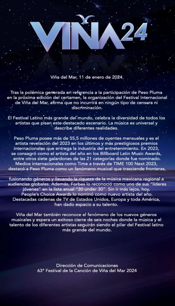 La organización del Festival de Viña del Mar emitió una declaración pública en la que asegura que no incurrirán en ningún tipo de censura ni discriminación hacia los artistas. Con ello, aseguraron la presencia del cantante mexicano, Peso Pluma.