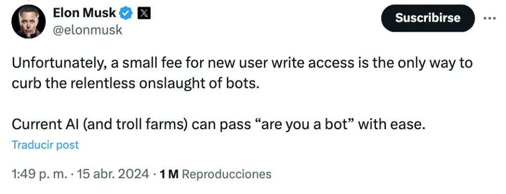 Es en ese contexto que Elon Musk responde al hilo de conversación iniciada por X Daily News y detalló que “Por desgracia, la única forma de frenar la incesante avalancha de bots es cobrar una pequeña cuota por el acceso de escritura de los nuevos usuarios”.