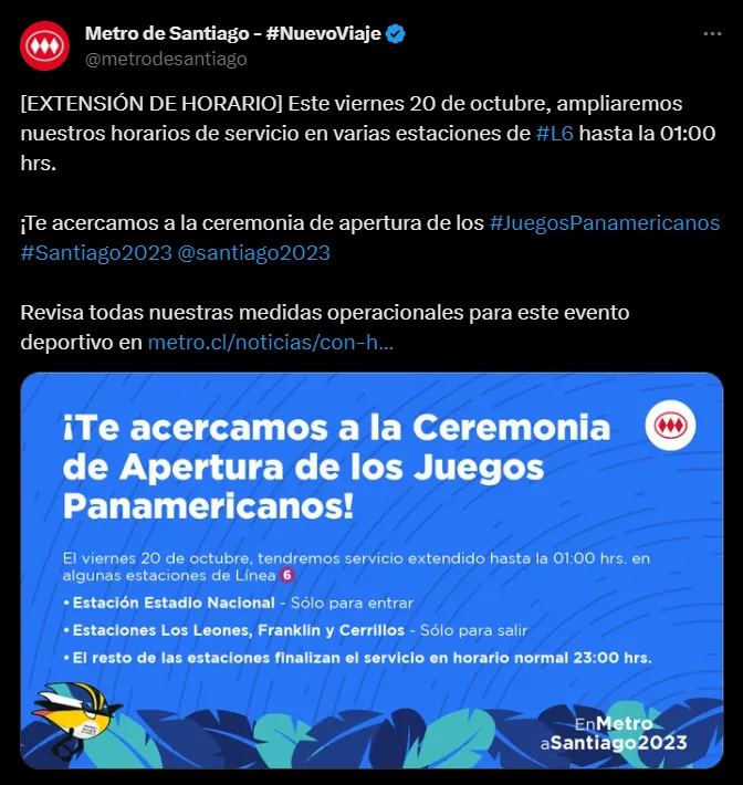 Este viernes 20 de octubre se dará comienzo oficial a los Juegos Panamericanos de Santiago 2023 con la realización de la ceremonia de inauguración, evento que está programado para las 20:30 horas de nuestro país y que traerá una importante noticia, ya que Metro de Santiago, con el objetivo de acercar este evento al público nacional, anunció una extensión en su horario para esta jornada.