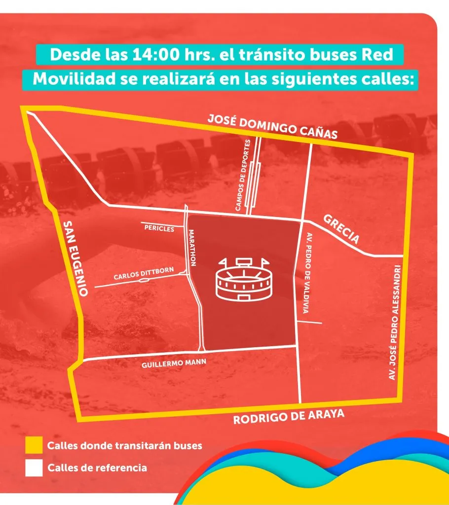 Además, desde las 14:00 horas, el tránsito de los buses Red Movilidad se realizará en las siguientes calles: