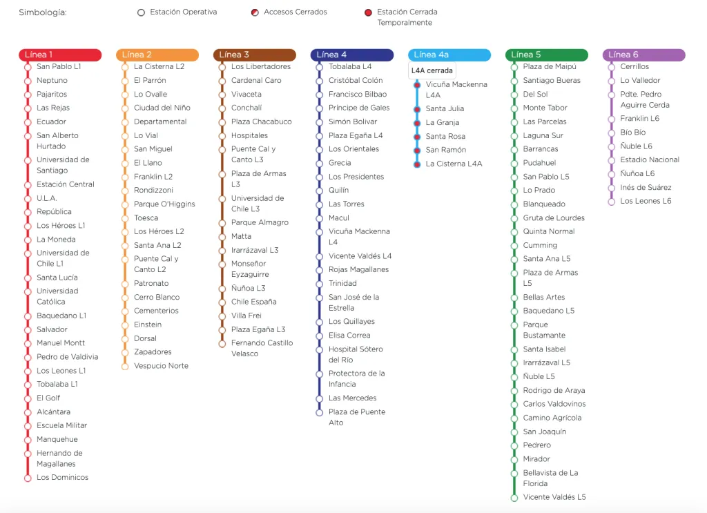 En ese contexto, sus combinaciones Vicuña Mackenna y La Cisterna no se encuentran disponibles al igual que las siguientes estaciones: