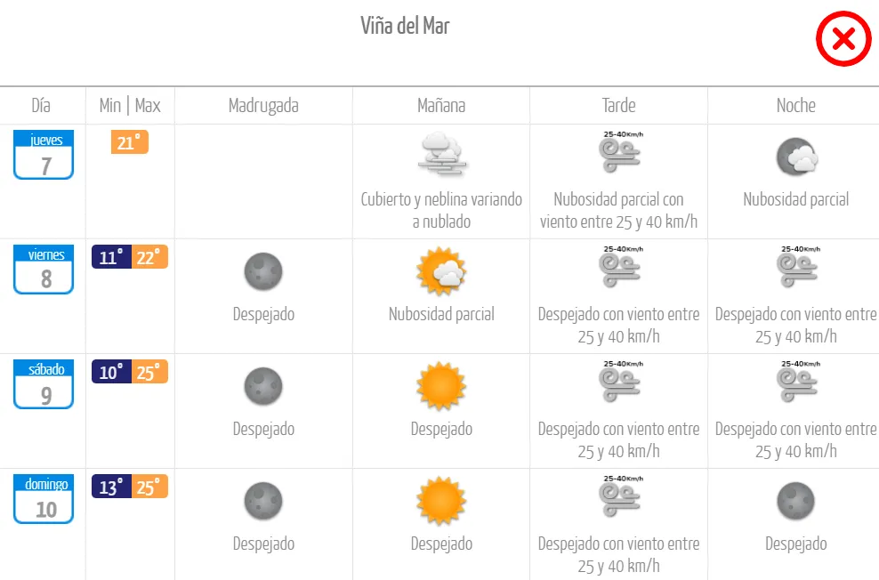 Para lo miles de afortunados que podrán disfrutar de unos días de descanso en la playa, se escaparán de las altas temperaturas de Santiago, aunque igualmente estará bastante caluroso. Así estará el clima en el litoral central, tomando como referencia a Viña del Mar según el pronóstico de la Dirección Meteorológica de Chile: