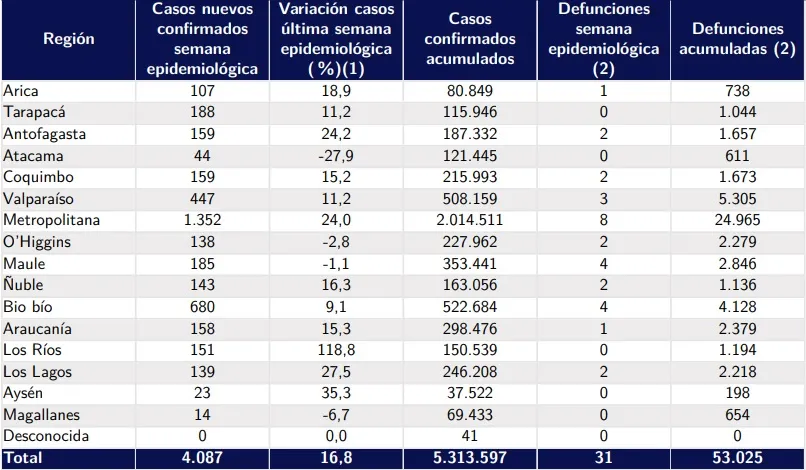 A nivel regional, el número de casos nuevos reportados aumentó en 12 regiones del país. Las regiones con mayor aumento son Los Ríos (118,8 %), Aysén (35,3 %) y Los Lagos (27,5 %).