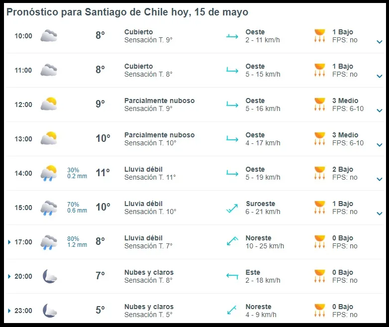 ¿A qué hora llueve hoy en Santiago?