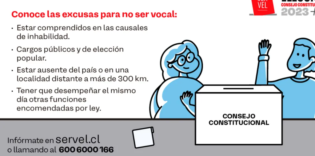 Desde Servel informaron que si eres vocal de mesa y deseas excusarte, puedes hacerlo por escrito ante el Secretario de la Junta Electoral respectiva dentro de un plazo de tres días hábiles, hasta el miércoles 29 de noviembre. Las excusas válidas, según el artículo 44 de la Ley 18.700, son las siguientes: