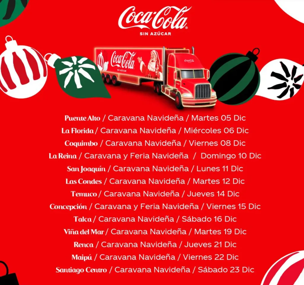 “Para esta edición, la Caravana Navideña Coca‑Cola incluirá diversas actividades, entre las que destaca el recorrido por las calles de los tradicionales camiones decorados e iluminados con motivos festivos, a los cuales se le sumará en algunos puntos la realización de un festival gastronómico, donde los asistentes podrán disfrutar de platos tradicionales, talleres de decoración navideña, villancicos y fotos junto al Viejito Pascuero”, señala la página web oficial del evento.