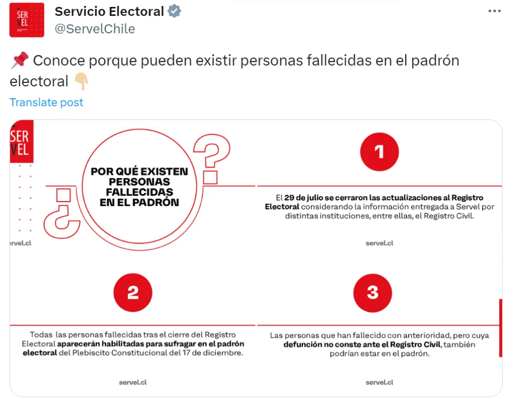 El Servel además informó que, las personas que hayan fallecido con anterioridad, pero cuya defunción no conste ante el Registro Civil, también podrían estar incluidas en el padrón electoral.