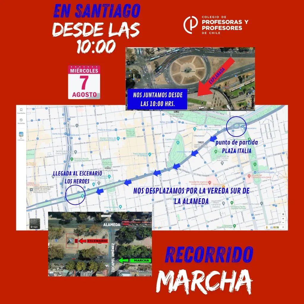 El sitio web de la entidad ha señalado que la movilización de docentes en Santiago se producirá este miércoles 7 de agosto a partir de las 10:00 am horas en la explanada del Metro Baquedano, donde se espera marchar hasta el Metro Los Héroes, sector en el que se ubicará el escenario central.